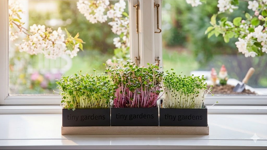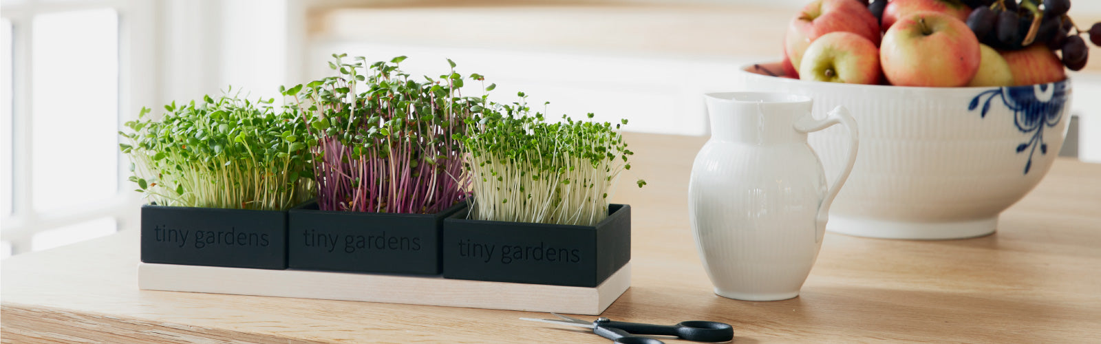 Jeg er glad for mine Tiny Gardens, der står i vindueskarmen i køkkenet hele året og dels pynter og giver lidt dekoration til middags- og gæstemaden. Det er nemt at så dem og så ellers bare fylde vand på ind imellem. Hurtig levering og nem hjemmeside at købe ind på.