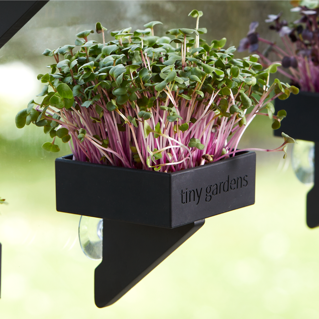Tiny Gardens spirebakke er udstyret med et innovativt selvvandingssystem, der gør det muligt at dyrke mikrogrønt helt uden jord og gødning - du dyrker i stedet for i hampemåtter.